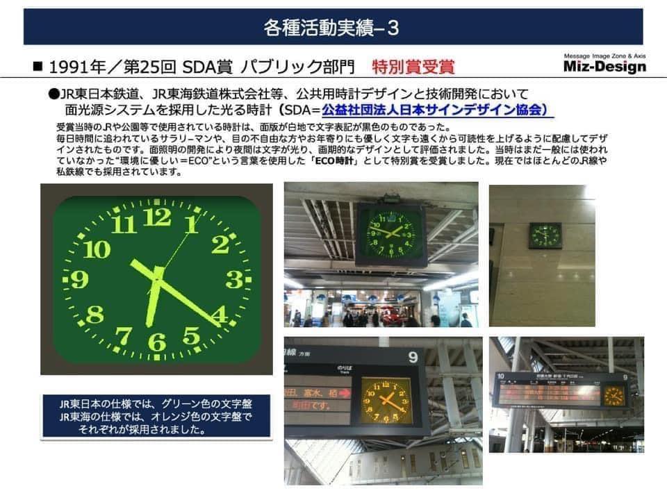 ・1964年 東京オリンピック シンボルマーク設計 ・1991年 SDA賞パブリック部門特別賞受賞(JR蛍光時計デザイン) ・2002年 デリスタウン セルフガソリンスタンド複合施設化モデル ・2010年 ampm ロゴ・サイン設計 ・2011年 Office.3.11 ロゴマークデザイン ・2011-2012年 ニッポンレンタカー 店舗CI再設計(LED化80%コスト削減)